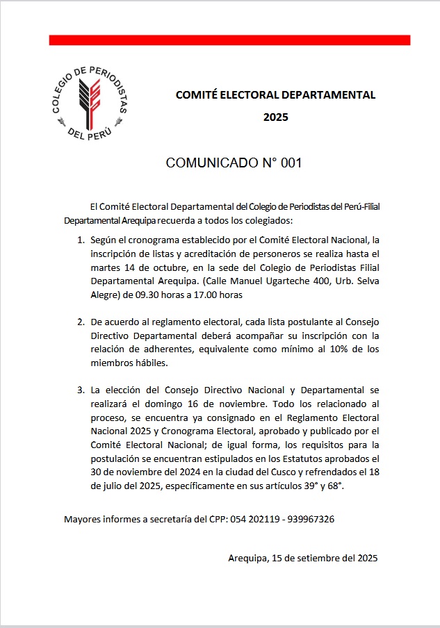 Anuncio de límite de inscripción de listas y acreditación de personeros. 15/9/2025