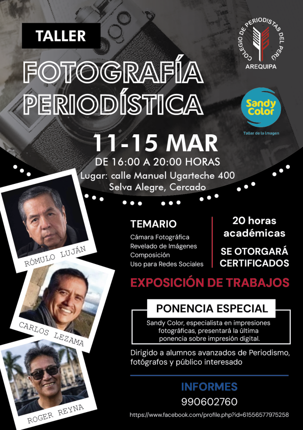 Los expositores son de amplia trayectoria: Rómulo Luján, reconocido fotoperiodista, docente en la Escuela Superior de Periodismo Jaime Bausate y Meza; Carlos Lezama, editor gráfico de agencia Andina y Roger Reyna, fotógrafo en las agencias de Noticias -United Press International – UPI , Associated Press – AP, Agence France-Presse – AFP, Fotógrafo-Agencia Reuters – Fotógrafo y la empresa Sandy Color, especialista en Impresiones Fotográficas.