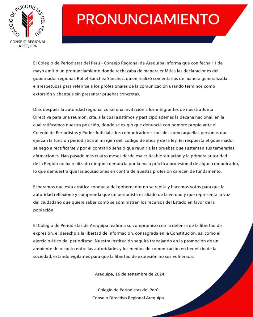 Colegio de Periodistas del Perú CRA reitera reflexión a gobernador regional 16/setiembre/2024