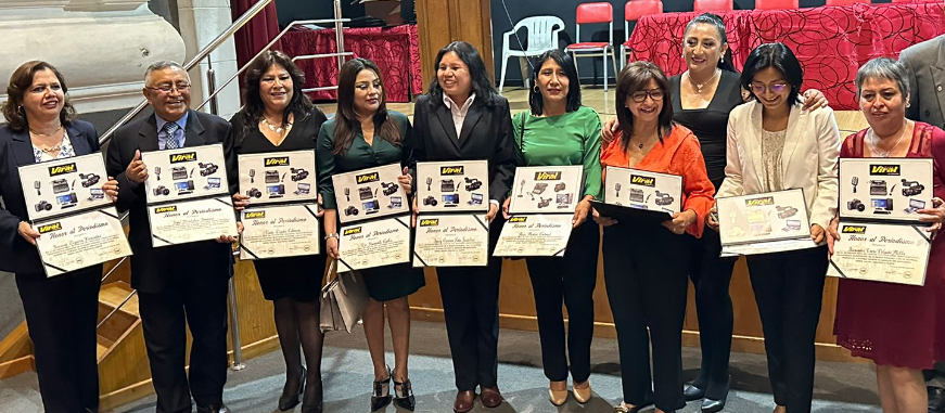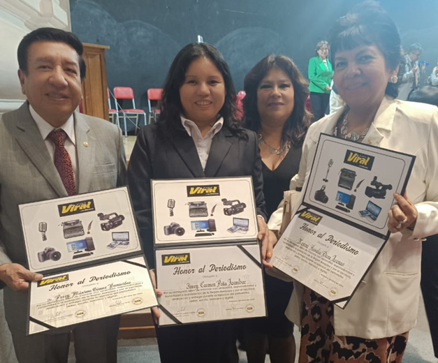 Periodistas siendo reconocidos junto a directivos del Colegio: Karola Lara y Héctor Mayhuire