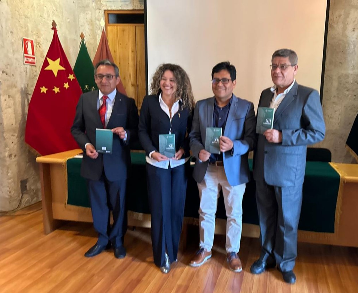 Los coordinadores de la presentación del libro: Carmen Rivera y Federico Rosado, el decano del Colegio de Periodistas Arequipa, Héctor Mayhuire y los autores: Juan Carlos Soto y Cristhian Ticona.